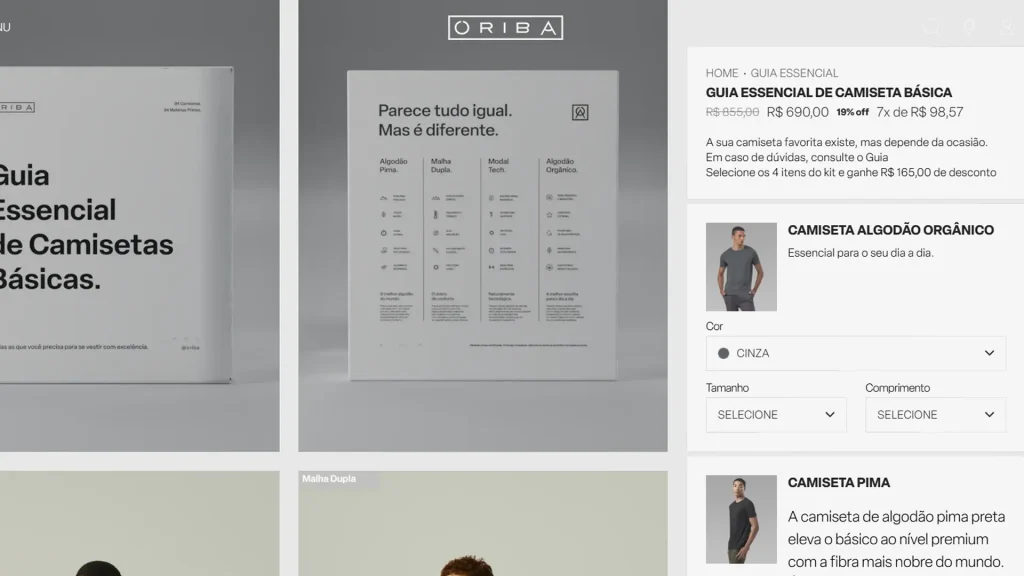 Na experiência de compra da Oriba potenciada pela Wake, a página de produto deixa de ser um catálogo estático e se torna um fluxo de vendas ativo. Ao navegar por uma peça, o usuário é convidado a completar um pack. A flexibilidade da plataforma permite que a Oriba configure essas regras sem depender de plugins de terceiros que deixem o site lento ou gerem erros de cálculo no carrinho.